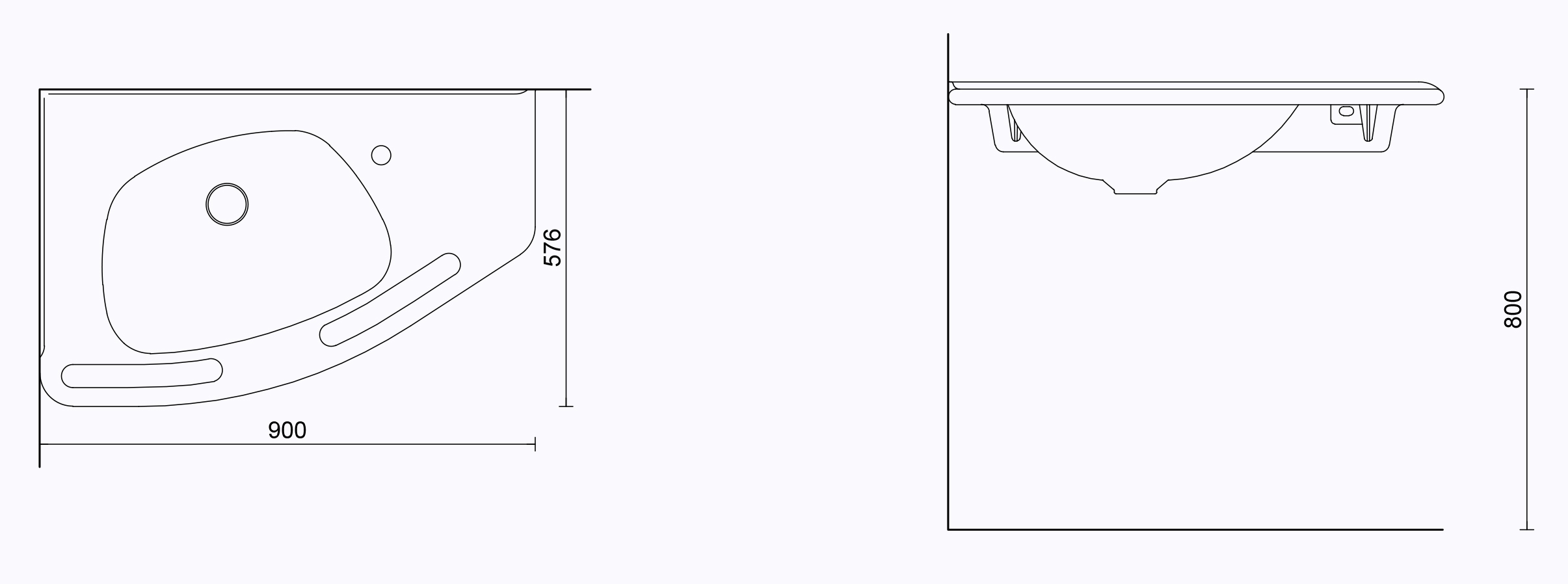 A white pop-up drain plug, fixed water trap, and mounting hardware are included with the basin. Right- and left-handed basins are available, classified by the direction of the tapered tail. The basin can also be customized to not include the overflow drain opening.