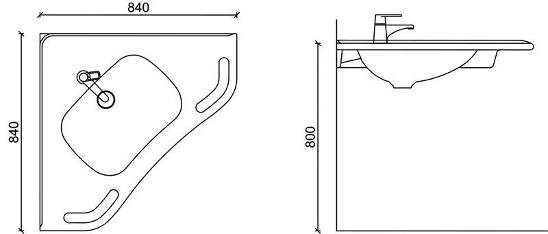 The side width is 840 mm (in cut corner basin 560 mm), with 740 mm diagonal length from the corner to the front rim. Load-bearing capacity of the basin is +400 kg.
