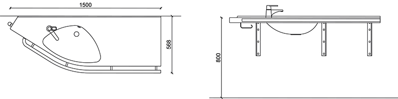 Plus basin and rails sustain 230 kg of weight (VTT (RTE 3664/01). Right- and left-handed basins are available, classified by the direction of the tapered tail. The recommended mounting height is 800 mm.