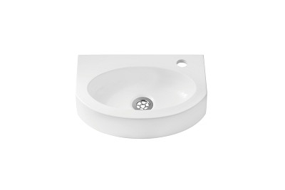The curve of the front rim of the corner wash basin makes it easier to approach the basin and lean over it. The basin is made of durable and antimicrobial composite material, providing a seamless and hygienic finish. New European PMR standards are embodied in the design, for example in the angled front rim, that ensures water stays inside the basin. A water trap and mountings for the fixed basin are included with the delivery. Load-bearing capacity of the basin is max. 400 kg.