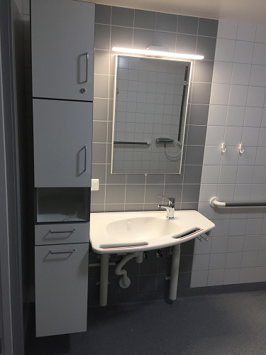 The renovation project of Hornstulls servicehus was completed by Peab in late 2016, on behalf of Micasa. Korpinen supplied 90 complete bathroom packages, which included electronically height-adjustable toilets and washbasins. The bathrooms have also been fitted with contrasting colours for support handles, washbasins, showers, and toilets so as to facilitate spatial perception among residents.