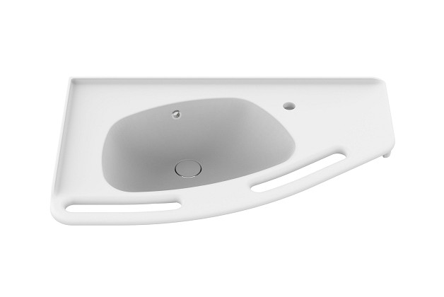 The basin design embodies the new European PMR standard, which requires 300 mm empty space below to allow for wheelchair access.