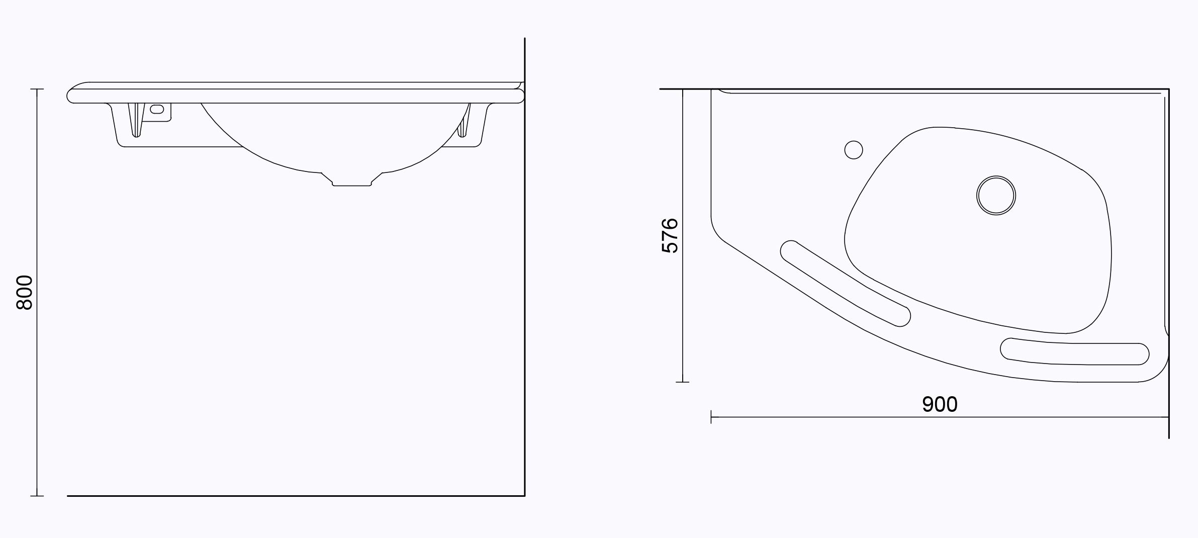 A white pop-up drain plug, fixed water trap, and mounting hardware are included with the basin. Right- and left-handed basins are available, classified by the direction of the tapered tail. The basin can also be customized to not include the overflow drain opening.