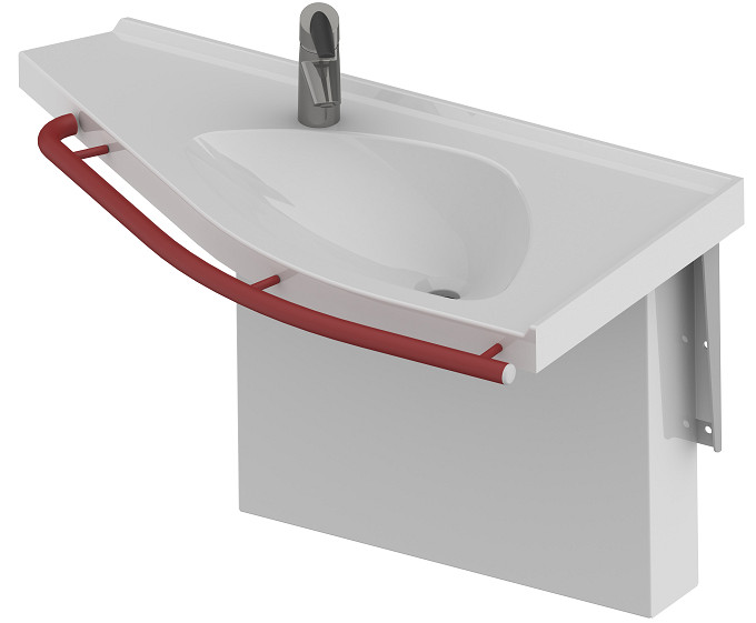 Original basins are made of a durable and antimicrobial cast marble. A Korpinen classic, the Original basin has fixed rails in front to support standing and ease approach. The angle of the front rim ensures that splashes stay inside the basin. Rails are available in different accent colours, to promote better spatial recognition. Colour options for rails: white (RAL 9016), grey (RAL 7037) and red (RAL 3003).