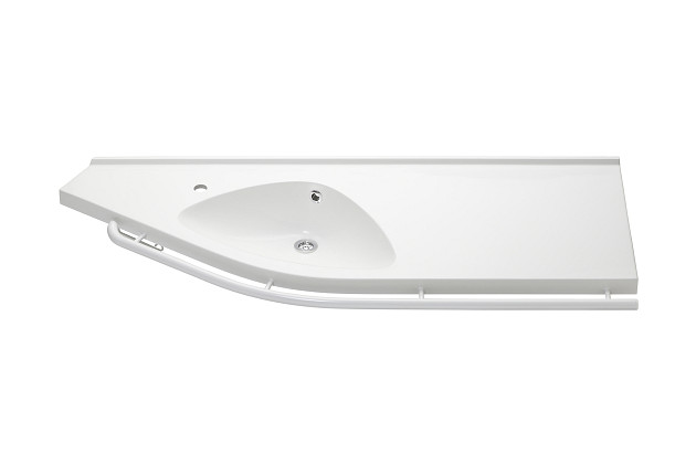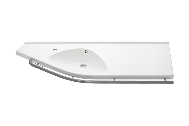 Plus basins are made of a durable and antimicrobial cast marble. The Plus basin has fixed rails in front to support standing and ease approach. The angle of the front rim ensures that splashes stay inside the basin. Rails are available in different accent colours, to promote better spatial recognition. The 1500 mm width provides a broad table top, with capacity to add a wall-mounted cabinet below the tapered end.