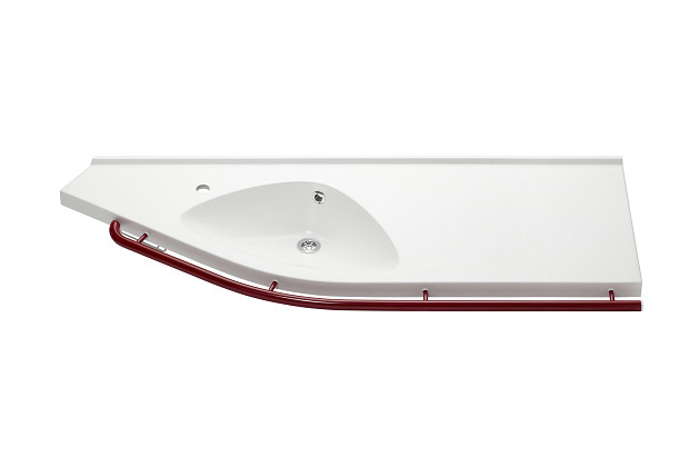 Plus basins are made of durable and antimicrobial cast marble. The Plus basin has fixed rails in front to support standing and ease approach. The angle of the front rim ensures that splashes stay inside the basin. Rails are available in different accent colours, to promote better spatial recognition: white (RAL 9016), grey (RAL 7037), red (RAL 3003) and stainless steel. The 1500 mm width provides a broad tabletop, with a capacity to add a wall-mounted cabinet below the tapered end.