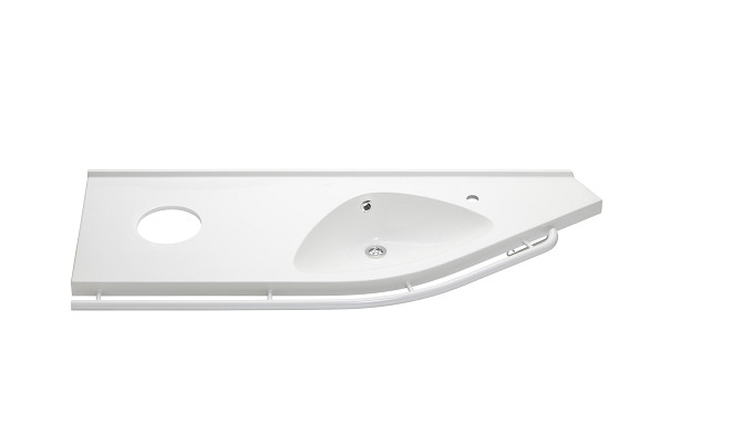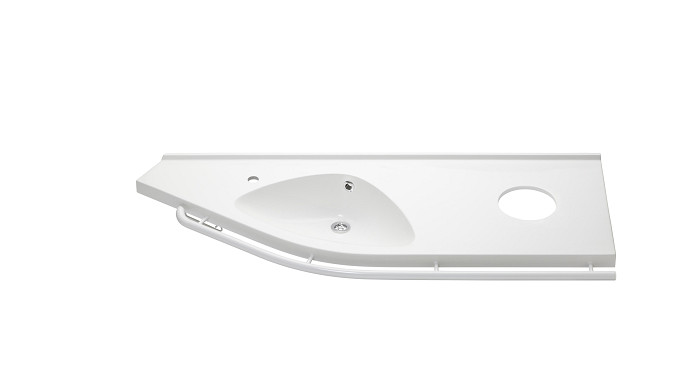 Rails are available in different accent colours, to promote better spatial recognition, with dark granite and white base colors available. The 1500 mm width provides a broad tabletop, with a capacity to add a wall-mounted cabinet below the tapered end.