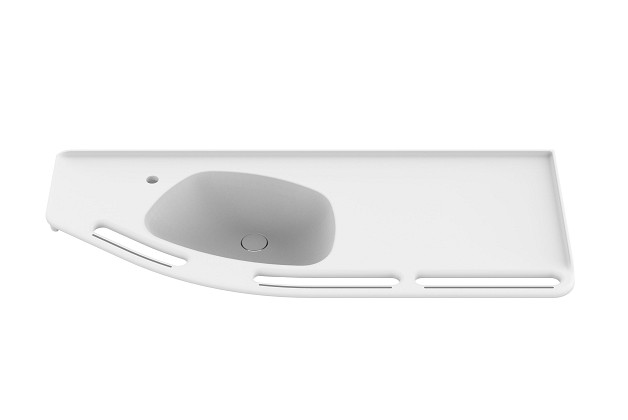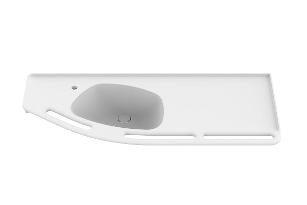 Gaius Sense Plus basins are made of a durable and antimicrobial composite material. The basin is seamless, with fixed rails in front to support standing and ease approach. The angle of the front rim ensures that splashes stay inside the basin. Additional accent colour strips are available for the rails to promote better spatial recognition.