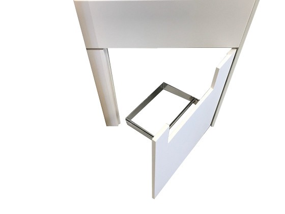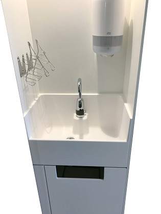 Niche basin is made of an antimicrobial composite material, which makes it durable and hygienic. Ideally suitable for hospital or health clinic patient rooms or in hallway alcoves. The basin is customizable with right- and left-handed doors.