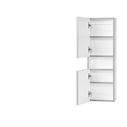 The wall mounted utility cabinets ease cleaning in humid bathroom conditions. The white moisture resistant frame, made of 16 mm melamine, ensures longevity in active use. Doors are made of high-pressure laminate with additional grey accent strips along the edges to promote spatial recognition. Orientation of the doors is changeable.