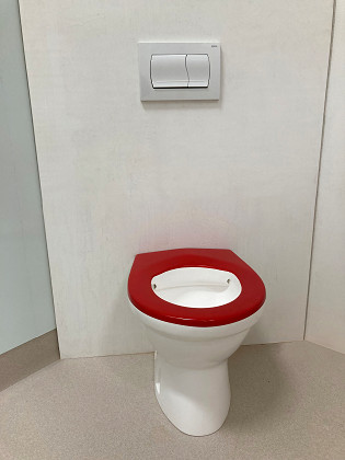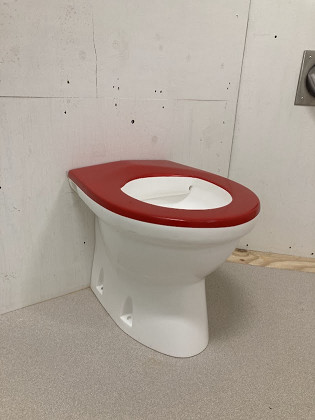 Korpinen's composite WC seat is wall-mounted but resists breakage from jumping on it, thanks to a floor-reaching support leg.