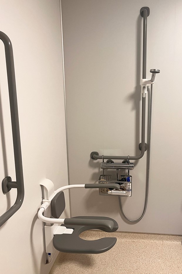 ”Toiveena on, että asukas pärjäisi itsenäisesti, mutta lisäavulle on ollut tarvetta, joten ateriat valmistetaan ja syödään yhdessä. On hienoa, että kaikilla seinillä on tukikahvat, joista vanhukset voivat pitää kiinni, mikäli tasapaino horjuu. Käytämme aina suihkuistuimia, jotka ovat erittäin hyvä apuväline meille työntekijöille.”, kertoo palvelukodissa hoitajana työskentelevä Helene Hanssen.