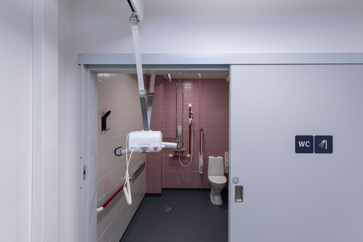 Nostinasennuksissa suosittiin lähes vapaan liikkuvuuden mahdollistavia H-kiskoja – kylpyhuoneissa potilas pystyy nostoliinoissakin ollessaan asioimaan luontevasti wc-istuimella, suihkussa ja pesualtaalla.