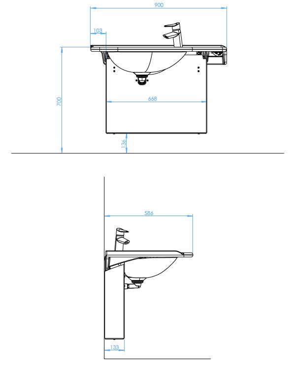 Korkeudensäätömekanismi, sähköjohdot ja putket jäävät suojakotelon taakse piiloon, jolloin allaskokonaisuudesta tulee tyylikäs. Korkeudensäätölaitteen valkoiset metalliosat on käsitelty antimikrobisella maalilla. Laitteen roiskesuojausluokitus on IP44 ja käyttöjännite 230V AC.