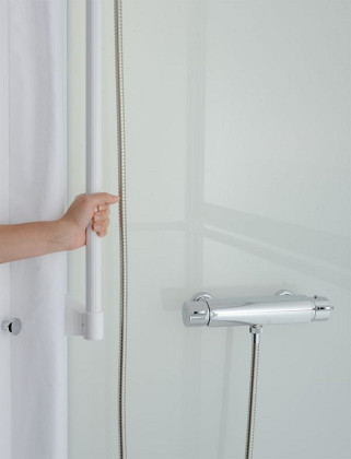 Esteetön suihkukaappi sisältää valmiiksi tukikaiteen takaseinällä ja sivuseinällä, suihkuverhon, suihkutangon, käsisuihkun sekä asennuksessa yleisesti tarvittavat poistovesiputket. Suihkukaappien verho on kiinnitetty sekä yläreunasta että alareunasta ja se pysyy paikallaan suorana käytön aikana.