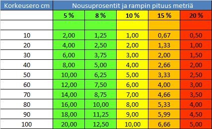 Liikkumisesteisille ramppia tehdessä, on hyvä seurata Ympäristöministeriön ohjeistusta ja toteuttaa luiska 5-8 % kaltevuudella. Jyrkempää luiskaa kuin 20 %, on usein mahdotonta käyttää avustettunakaan. Kaavio antaa tietoa rampin pituudesta ja nousukulmasta eri korkeuseroilla.