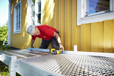 Rampin yläpäähän ja alapäähän on omat luiskansa. Alumiiniset osat ovat keveitä siirtää paikalleen ja helppoja kiinnittää toisiinsa. Rampista voidaan tehdä kuinka pitkä tahansa.