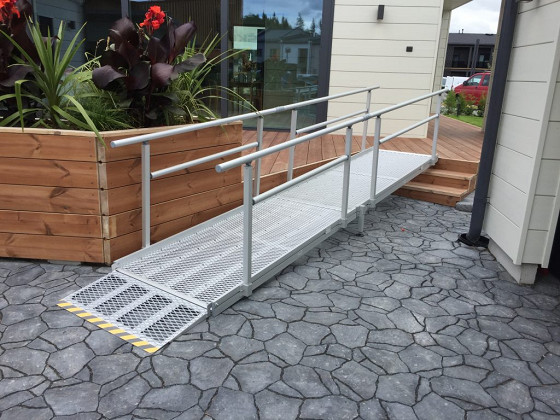 Rampin yläpäähän ja alapäähän on omat luiskansa. Alumiiniset osat ovat keveitä siirtää paikalleen ja helppoja kiinnittää toisiinsa. Rampista voidaan tehdä kuinka pitkä tahansa.