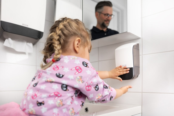 Kestävä ja helppokäyttöinen Katrin saippua-annostelija sopii nestesaippualle, vaahtosaippualle ja suihkugeelille. Läpinäkyvien sivupaneelien ansiosta täyttötarpeen voi helposti nähdä ilman, että annostelijaa tarvitsee avata. Annostelija voidaan lukita avaimella tai käyttää ilman avainta. Koko etupaneelin levyinen työntöpainike tekee annostelijan käytöstä vaivatonta kaikille, ja pistekirjoitus on mukana näkörajoitteisia varten. Annostelijan muoviosat ja lukko on valmistettu kestävistä materiaaleista.