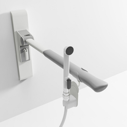 Nivelletty käsisuihkun pidike Sense-tukikaiteeseen. Nivelen ansiosta käsisuihkun asento mukautuu luonnollisesti tukikaiteen asennon mukaan. Pikakiinnityksen ansiosta asennus on helppoa ja vaivatonta. Kannakkeen paikka on vapaasti valittavissa koko otepinnan matkalta ja paikkaa voidaan vaihtaa myöhemmin tarvittaessa.