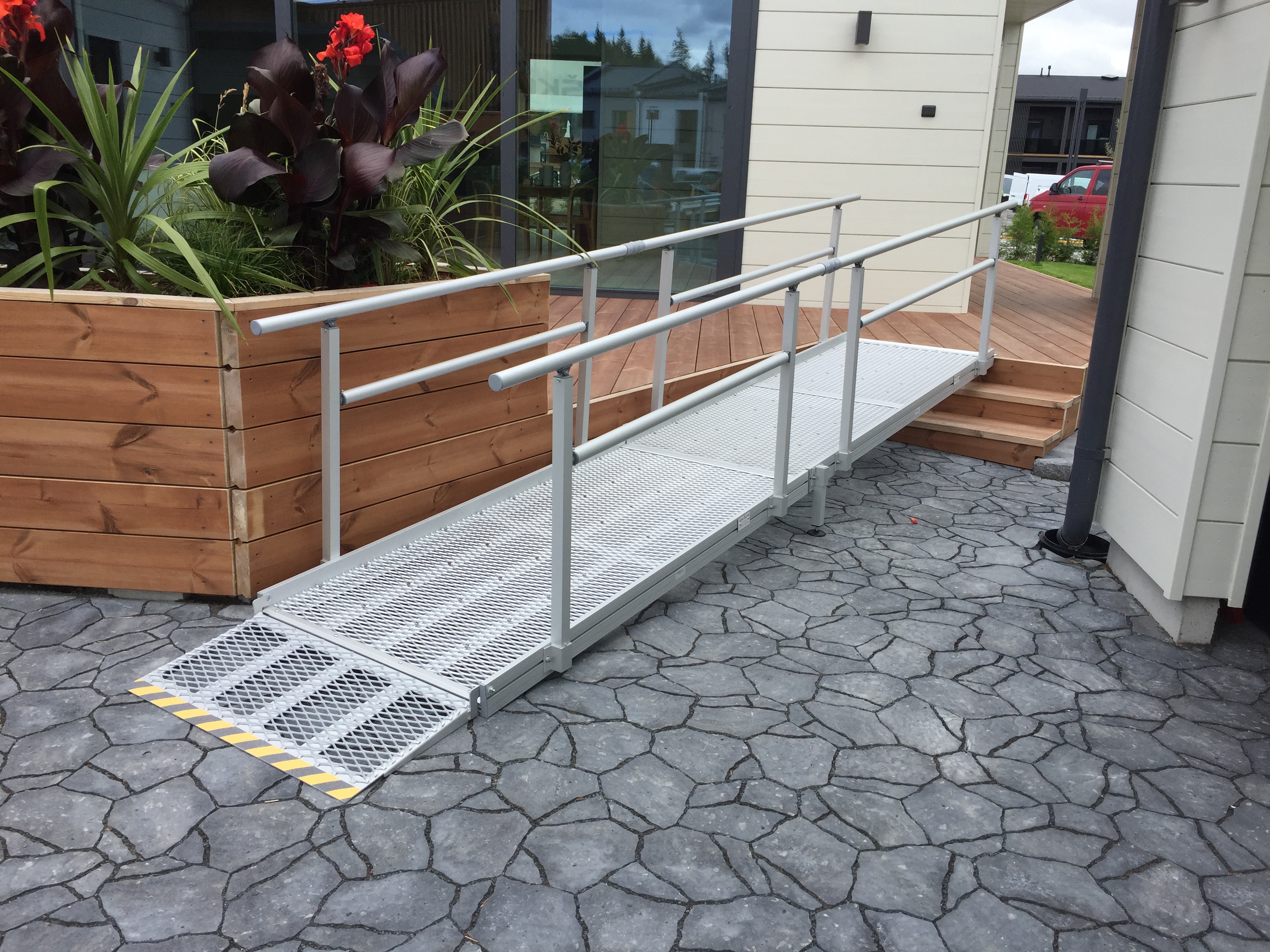 Kvistberga alumiininen ramppi on kevyt ja helppo asentaa paikalleen. Moduuleista kasattava ramppi on monipuolisesti muokattava ja uudelleen asennettavissa. Kulkutasona on verkko, joka pysyy puhtaana. Portaattomasti säädettävät jalat helpottavat asennustyötä ja turvalliset kaiteet varmistavat halutun lopputuloksen. Lue lisää