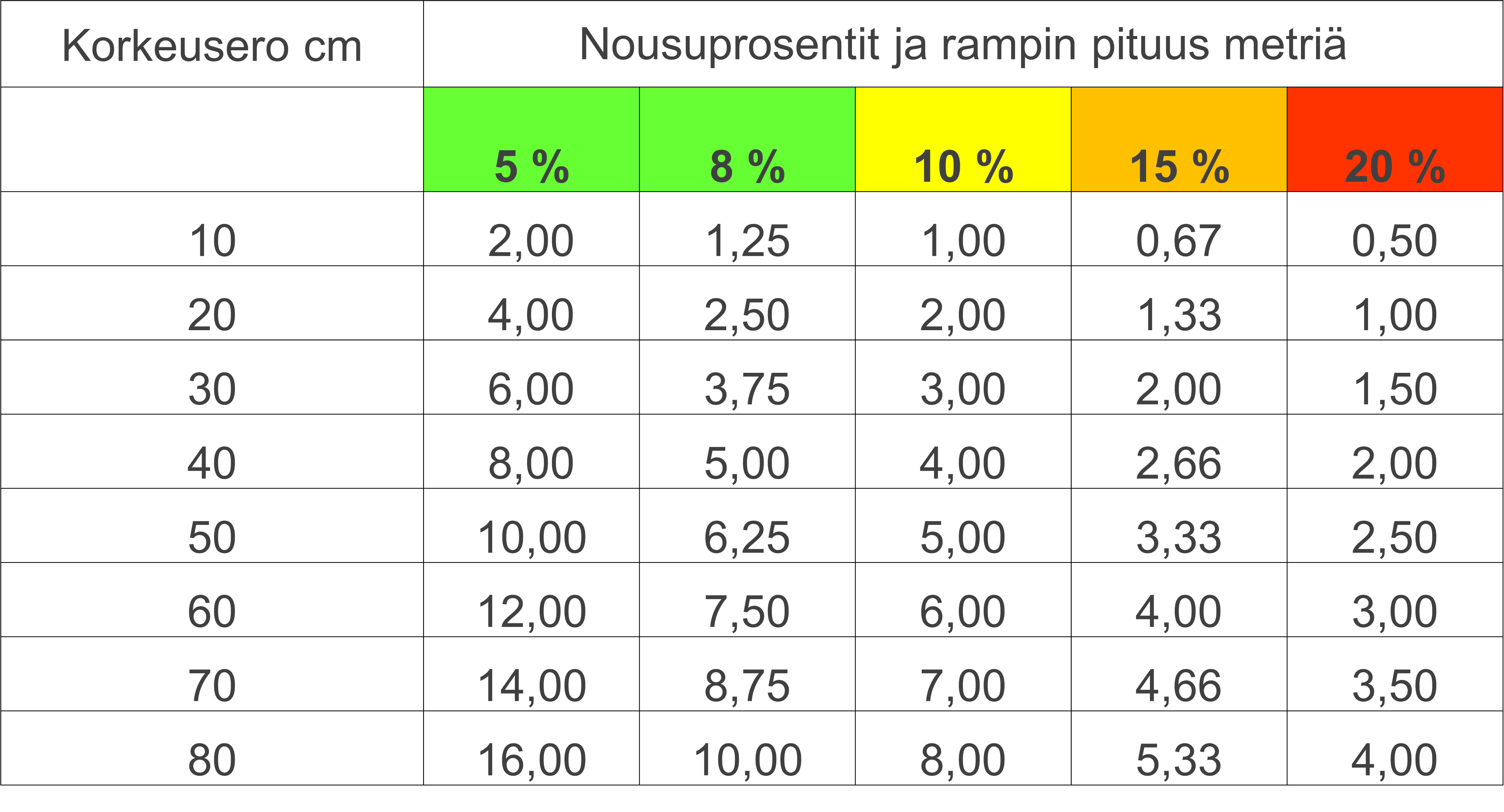 Suositeltava luiskan jyrkkyys on 8 % (1:12,5). Tämä tarkoittaa 8 cm nousua yhden metrin matkalle luiskaa. Tyypillinen kolmen askelman nousu on 40 cm ja tähän sopiva 8 % luiska on pituudeltaan 5 metriä. 8 % luiskassa tulee olla lepotasanne aina 5 metrin välein.