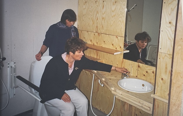 Toisaalla Vanhustyön keskusliitossa projektipäällikkönä työskennellyt arkkitehti Kirsti Pesola kiersi ympäri Suomea keräämässä aineistoa palveluasumisen tasosta. Raha-automaattiyhdistyksen rahoittaman projektin tavoitteena oli kehittää suunnitteluohjeet fyysisesti huonokuntoisten vanhusten ryhmäkodeille. ”Tällä tiedonkeruukierroksella oli silmiinpistävää wc-kylpyhuonetilojen suunnittelemattomuus”, muistelee Pesola.